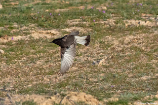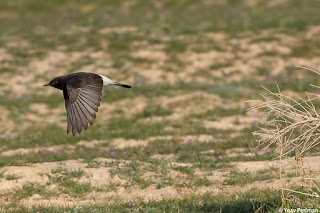 This productivity attracts caterpillar-eating birds, and indeed wheatear densities were exceptionally high. White-crowned, Mourning and Black-tailed (AKA Blackstart) Wheatears were present in unusually big numbers. Among the rare wheatears, first up was the Kurdish Wheatear found a few days ago, a fine 1cy male. Very nice plumage, but he didn't want to play ball. When we first found him, he flew towards us, as if checking whether we had mealworms on offer. We didn't, so he kept his distance and was usually in a bad angle. Yet, a great bird to watch.